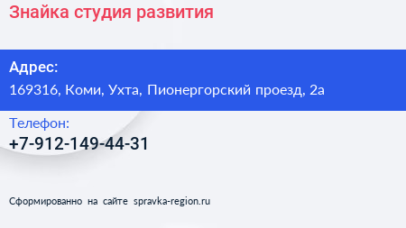 Знайка, студия развития по адресу 169316, Коми, Ухта, Пионергорский проезд, 2а в дальнейшем Организация, размещена в следующих категориях: