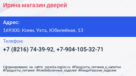 Ирина, магазин дверей по адресу 169300, Коми, Ухта, Юбилейная, 13 в дальнейшем Организация, размещена в следующих категориях: