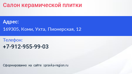 Салон керамической плитки по адресу 169305, Коми, Ухта, Пионерская, 12 в дальнейшем Организация, размещена в следующих категориях: