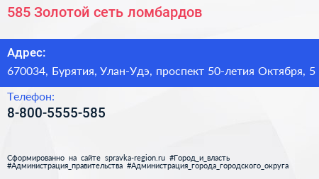 585*Золотой, сеть ломбардов по адресу 670034, Бурятия, Улан-Удэ, проспект 50-летия Октября, 5 в дальнейшем Организация, размещена в следующих категориях: