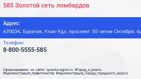 585*Золотой, сеть ломбардов по адресу 670034, Бурятия, Улан-Удэ, проспект 50-летия Октября, 6а в дальнейшем Организация, размещена в следующих категориях:
