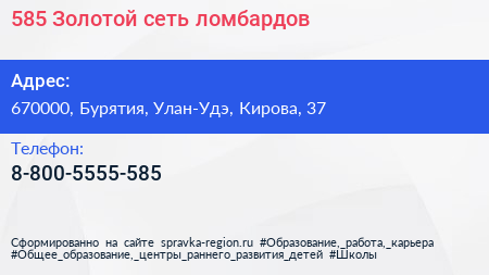 585*Золотой, сеть ломбардов по адресу 670000, Бурятия, Улан-Удэ, Кирова, 37 в дальнейшем Организация, размещена в следующих категориях: