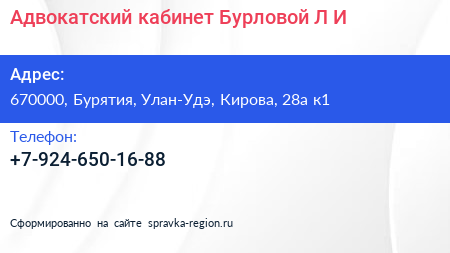 Адвокатский кабинет Бурловой Л.И. по адресу 670000, Бурятия, Улан-Удэ, Кирова, 28а к1 в дальнейшем Организация, размещена в следующих категориях: