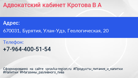 Адвокатский кабинет Кротова В.А. по адресу 670031, Бурятия, Улан-Удэ, Геологическая, 20 в дальнейшем Организация, размещена в следующих категориях: