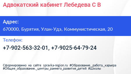 Адвокатский кабинет Лебедева С.В. по адресу 670000, Бурятия, Улан-Удэ, Коммунистическая, 20 в дальнейшем Организация, размещена в следующих категориях: