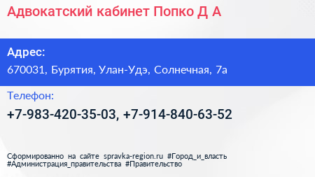 Адвокатский кабинет Попко Д.А. по адресу 670031, Бурятия, Улан-Удэ, Солнечная, 7а в дальнейшем Организация, размещена в следующих категориях: