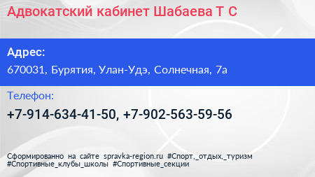 Адвокатский кабинет Шабаева Т.С. по адресу 670031, Бурятия, Улан-Удэ, Солнечная, 7а в дальнейшем Организация, размещена в следующих категориях:
