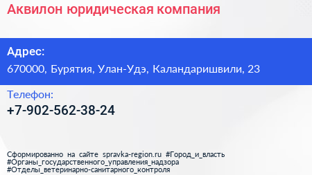 Аквилон, юридическая компания по адресу 670000, Бурятия, Улан-Удэ, Каландаришвили, 23 в дальнейшем Организация, размещена в следующих категориях: