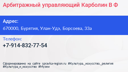 Арбитражный управляющий Карболин В.Ф. по адресу 670000, Бурятия, Улан-Удэ, Борсоева, 33а в дальнейшем Организация, размещена в следующих категориях: