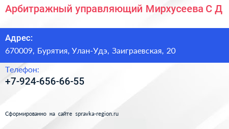 Арбитражный управляющий Мирхусеева С.Д. по адресу 670009, Бурятия, Улан-Удэ, Заиграевская, 20 в дальнейшем Организация, размещена в следующих категориях: