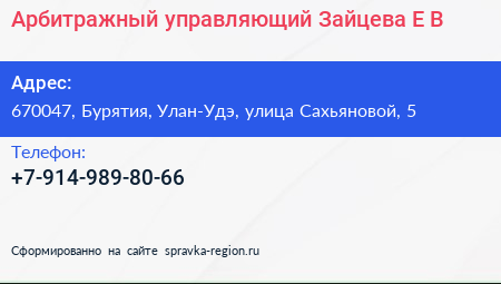 Арбитражный управляющий Зайцева Е.В. по адресу 670047, Бурятия, Улан-Удэ, улица Сахьяновой, 5 в дальнейшем Организация, размещена в следующих категориях: