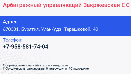 Арбитражный управляющий Закржевская Е.С. по адресу 670031, Бурятия, Улан-Удэ, Терешковой, 40 в дальнейшем Организация, размещена в следующих категориях: