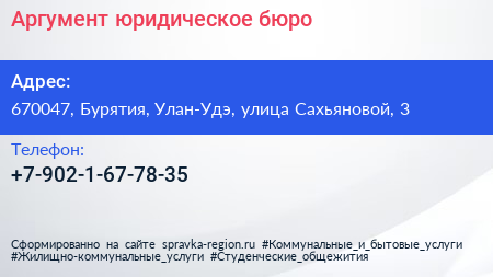 Аргумент, юридическое бюро по адресу 670047, Бурятия, Улан-Удэ, улица Сахьяновой, 3 в дальнейшем Организация, размещена в следующих категориях: