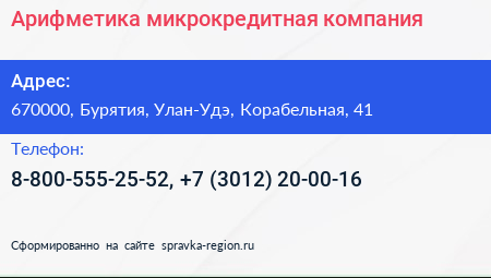 Арифметика, микрокредитная компания по адресу 670000, Бурятия, Улан-Удэ, Корабельная, 41 в дальнейшем Организация, размещена в следующих категориях: