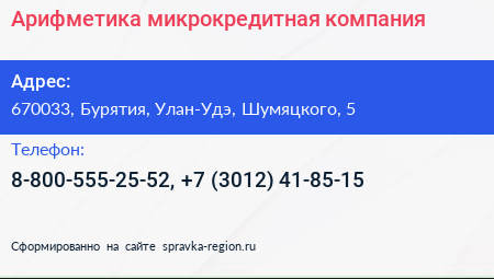 Арифметика, микрокредитная компания по адресу 670033, Бурятия, Улан-Удэ, Шумяцкого, 5 в дальнейшем Организация, размещена в следующих категориях: