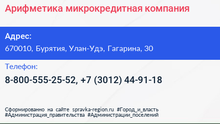 Арифметика, микрокредитная компания по адресу 670010, Бурятия, Улан-Удэ, Гагарина, 30 в дальнейшем Организация, размещена в следующих категориях: