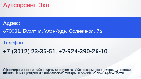 Аутсорсинг Эко по адресу 670031, Бурятия, Улан-Удэ, Солнечная, 7а в дальнейшем Организация, размещена в следующих категориях: