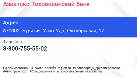Азиатско-Тихоокеанский банк по адресу 670002, Бурятия, Улан-Удэ, Октябрьская, 17 в дальнейшем Организация, размещена в следующих категориях: