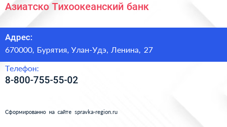 Азиатско-Тихоокеанский банк по адресу 670000, Бурятия, Улан-Удэ, Ленина, 27 в дальнейшем Организация, размещена в следующих категориях: