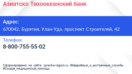 Азиатско-Тихоокеанский банк по адресу 670042, Бурятия, Улан-Удэ, проспект Строителей, 42 в дальнейшем Организация, размещена в следующих категориях: