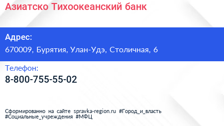 Азиатско-Тихоокеанский банк по адресу 670009, Бурятия, Улан-Удэ, Столичная, 6 в дальнейшем Организация, размещена в следующих категориях: