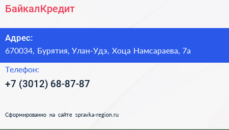 БайкалКредит по адресу 670034, Бурятия, Улан-Удэ, Хоца Намсараева, 7а в дальнейшем Организация, размещена в следующих категориях: