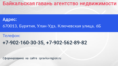 Байкальская гавань, агентство недвижимости по адресу 670013, Бурятия, Улан-Удэ, Ключевская улица, 6Б в дальнейшем Организация, размещена в следующих категориях: