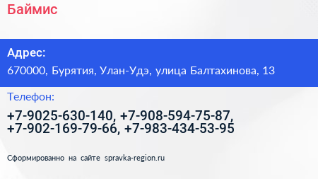 Баймис по адресу 670000, Бурятия, Улан-Удэ, улица Балтахинова, 13 в дальнейшем Организация, размещена в следующих категориях: