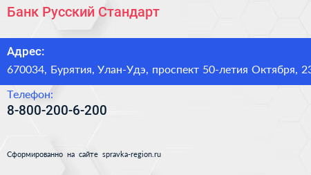 Банк Русский Стандарт по адресу 670034, Бурятия, Улан-Удэ, проспект 50-летия Октября, 23 в дальнейшем Организация, размещена в следующих категориях: