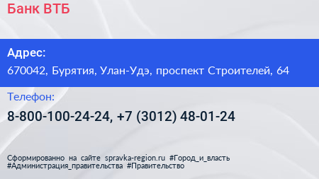 Банк ВТБ по адресу 670042, Бурятия, Улан-Удэ, проспект Строителей, 64 в дальнейшем Организация, размещена в следующих категориях: