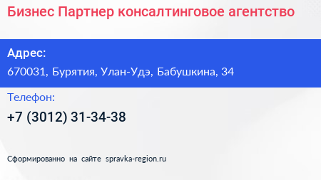 Бизнес Партнер, консалтинговое агентство по адресу 670031, Бурятия, Улан-Удэ, Бабушкина, 34 в дальнейшем Организация, размещена в следующих категориях:
