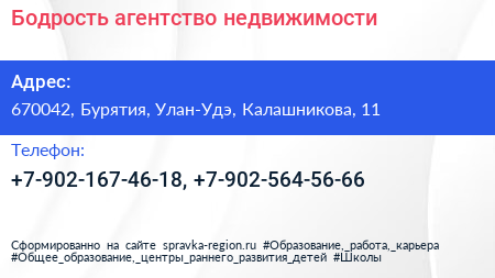 Бодрость, агентство недвижимости по адресу 670042, Бурятия, Улан-Удэ, Калашникова, 11 в дальнейшем Организация, размещена в следующих категориях: