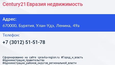 Century21 Евразия недвижимость по адресу 670000, Бурятия, Улан-Удэ, Ленина, 49а в дальнейшем Организация, размещена в следующих категориях: