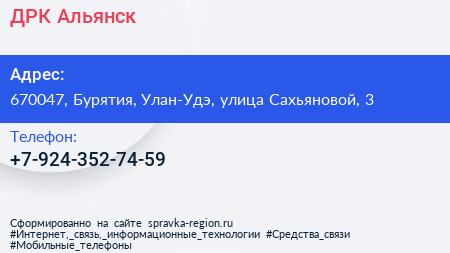 ДРК Альянск по адресу 670047, Бурятия, Улан-Удэ, улица Сахьяновой, 3 в дальнейшем Организация, размещена в следующих категориях: