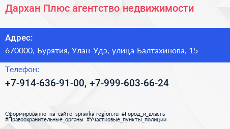 Дархан Плюс, агентство недвижимости по адресу 670000, Бурятия, Улан-Удэ, улица Балтахинова, 15 в дальнейшем Организация, размещена в следующих категориях:
