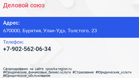 Деловой союз по адресу 670000, Бурятия, Улан-Удэ, Толстого, 23 в дальнейшем Организация, размещена в следующих категориях: