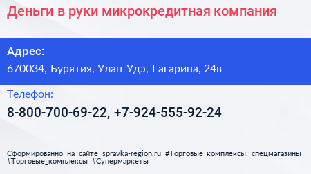 Деньги в руки, микрокредитная компания по адресу 670034, Бурятия, Улан-Удэ, Гагарина, 24в в дальнейшем Организация, размещена в следующих категориях: