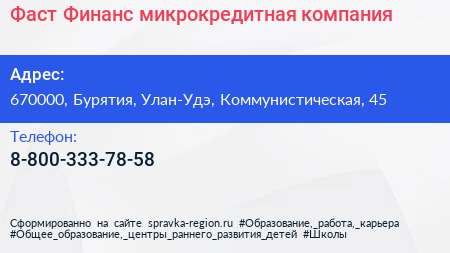Фаст Финанс, микрокредитная компания по адресу 670000, Бурятия, Улан-Удэ, Коммунистическая, 45 в дальнейшем Организация, размещена в следующих категориях: