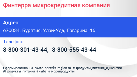 Финтерра, микрокредитная компания по адресу 670034, Бурятия, Улан-Удэ, Гагарина, 16 в дальнейшем Организация, размещена в следующих категориях: