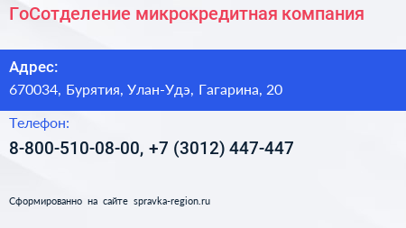 ГоСотделение, микрокредитная компания по адресу 670034, Бурятия, Улан-Удэ, Гагарина, 20 в дальнейшем Организация, размещена в следующих категориях: