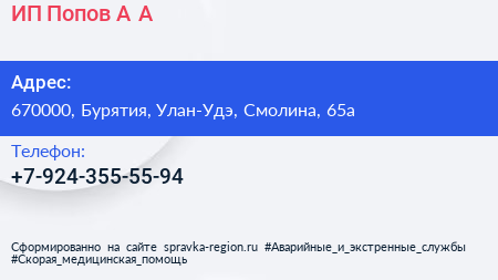 ИП Попов А.А. по адресу 670000, Бурятия, Улан-Удэ, Смолина, 65а в дальнейшем Организация, размещена в следующих категориях: