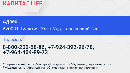 КАПИТАЛ LIFE по адресу 670031, Бурятия, Улан-Удэ, Терешковой, 2в в дальнейшем Организация, размещена в следующих категориях: