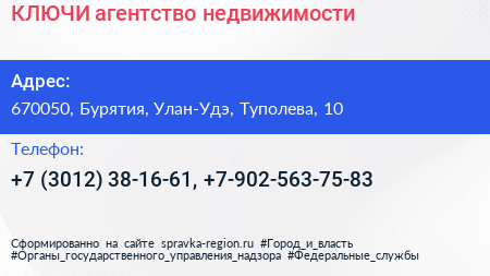 КЛЮЧИ, агентство недвижимости по адресу 670050, Бурятия, Улан-Удэ, Туполева, 10 в дальнейшем Организация, размещена в следующих категориях: