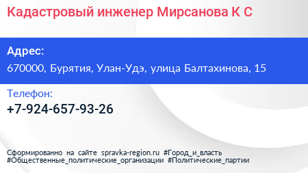 Кадастровый инженер Мирсанова К.С. по адресу 670000, Бурятия, Улан-Удэ, улица Балтахинова, 15 в дальнейшем Организация, размещена в следующих категориях: