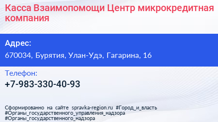 Касса Взаимопомощи Центр, микрокредитная компания по адресу 670034, Бурятия, Улан-Удэ, Гагарина, 16 в дальнейшем Организация, размещена в следующих категориях: