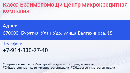 Касса Взаимопомощи Центр, микрокредитная компания по адресу 670000, Бурятия, Улан-Удэ, улица Балтахинова, 15 в дальнейшем Организация, размещена в следующих категориях: