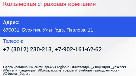 Колымская, страховая компания по адресу 670031, Бурятия, Улан-Удэ, Павлова, 11 в дальнейшем Организация, размещена в следующих категориях: