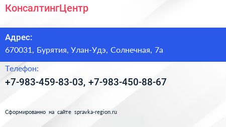 КонсалтингЦентр по адресу 670031, Бурятия, Улан-Удэ, Солнечная, 7а в дальнейшем Организация, размещена в следующих категориях:
