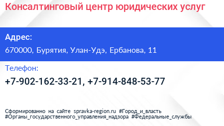 Консалтинговый центр юридических услуг по адресу 670000, Бурятия, Улан-Удэ, Ербанова, 11 в дальнейшем Организация, размещена в следующих категориях:
