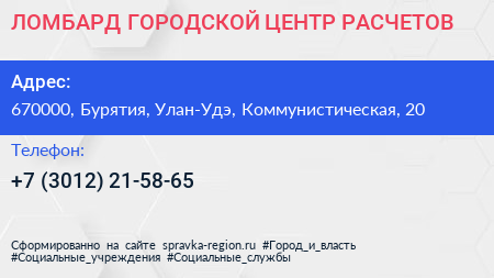 ЛОМБАРД ГОРОДСКОЙ ЦЕНТР РАСЧЕТОВ по адресу 670000, Бурятия, Улан-Удэ, Коммунистическая, 20 в дальнейшем Организация, размещена в следующих категориях: